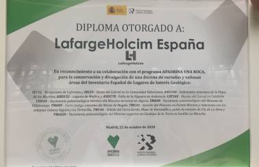 En el marco de su apuesta por la difusión y conservación del patrimonio geológico de los entornos mineros en los que opera, LafargeHolcim España ha recibido esta mañana, de manos de representantes del Instituto Geológico y Minero de España (IGME), un diploma que la acredita como empresa colaboradora con este programa que contribuye a la vigilancia de los Lugares de Interés Geológico de relevancia nacional e internacional del país que, por su valor científico, didáctico, divulgativo o turístico, es necesario proteger y conservar.